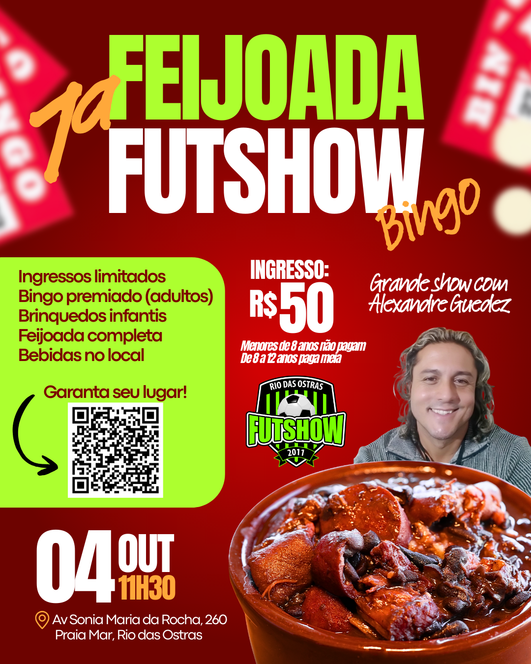 A Associação Atlética Futshow Rio das Ostras (AAFRO) promoverá no próximo dia 4 de outubro de 2025 a 1ª Feijoada Futshow, um evento voltado para associados, familiares e amigos. A confraternização acontecerá na Av. Sonia Maria da Rocha, nº 260, bairro Praia Mar, em Rio das Ostras, a partir das 11:30h, e promete reunir lazer, música e solidariedade em prol da construção da futura sede da entidade.